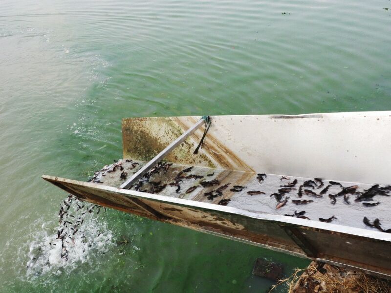 緊隨其后,便是高效順暢的增殖放流作業。運輸魚苗的車輛緩緩駛至淮河畔,輕輕傾斜車身,便于魚苗隨著水流自然滑入河中。放流人員迅速將車上的出口與不銹鋼槽連接,延伸至河面之上。隨著閘閥的開啟,水聲潺潺,魚兒沿著槽道歡騰跳躍,順暢地融入河水之中。這一過程既保護了魚苗,又確保了較高的成活率,同時提升了放流的效率。