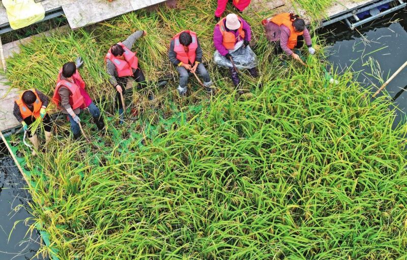 10月14日,工人在淮南市鳳臺縣顧橋鎮(zhèn)采煤沉陷區(qū)水面上收獲漂浮式水稻(無人機(jī)照片)。