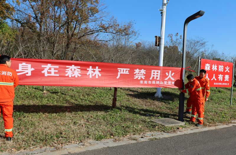 11月19日,市舜耕山管理處工作人員在環山路口懸掛宣傳橫幅。冬天來臨天干物燥,森林火險等級高,森林防火形勢嚴峻,我市林業部門加強宣傳,提升全社會防火意識,引導市民自覺遵守法律法規,防患于未然。