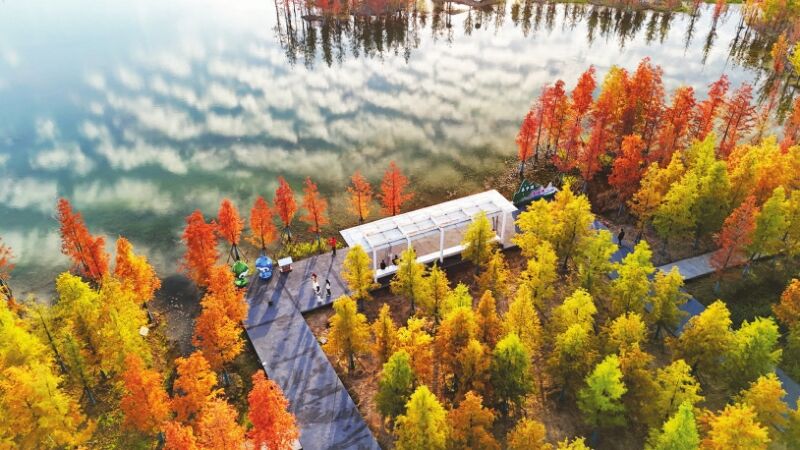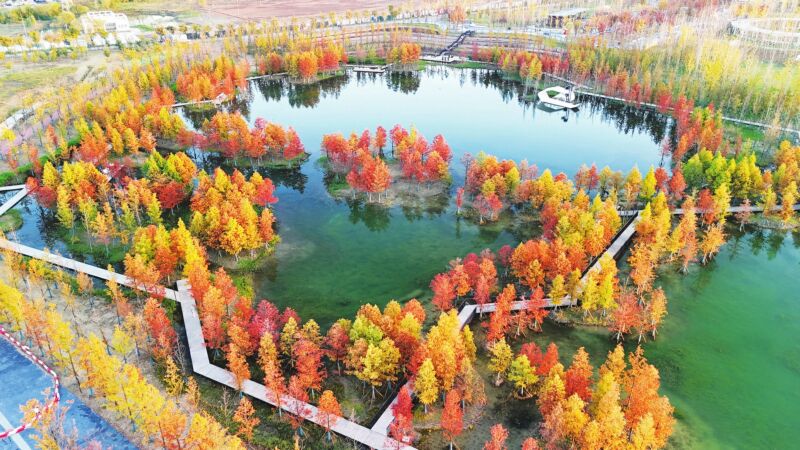 立冬時節,淮南春申湖公園內水杉、烏桕等植物五彩斑斕,色彩旖旎,構成一幅精美的“油畫”。