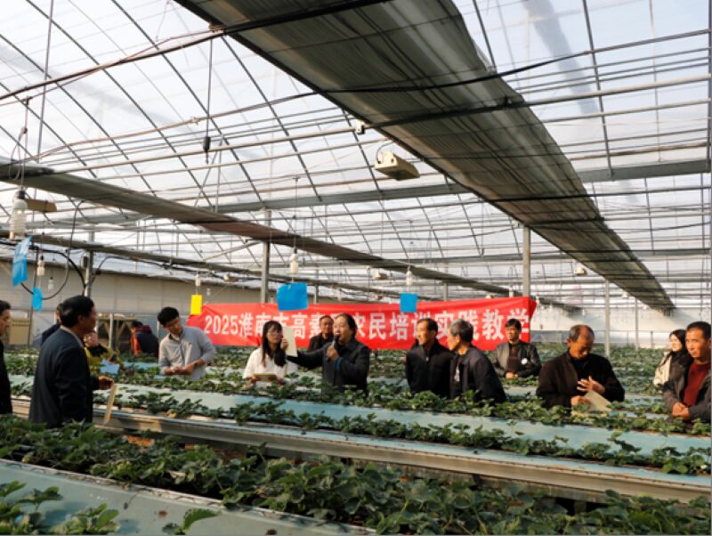 現場實踐教學中,指導老師從不同草莓品種的生長特性,到育苗繁育的關鍵步驟,再到病蟲害防治的綠色方案,對每一個種植細節都講解得清晰透徹。在老師指導下,學員們實操粘蟲除蟲的黃板、藍板懸掛及草莓老葉病葉摘除等技術。學員們一邊聆聽技術要點,一邊交流在本地種植中的難點、分享各自的銷售心得,討論熱烈。這樣的培訓方式更直觀,有助于讓草莓種植戶了解掌握先進技術和管理方法,提升專業技能,也為淮南草莓產業升級提供技術支撐和人才培養。