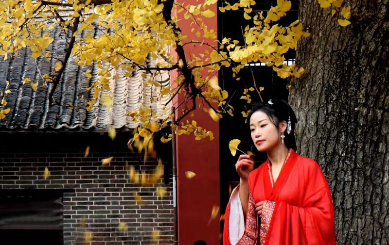 壽州古城報恩寺內的銀杏樹,據今已有1300多年歷史,歷經歲月滄桑依然枝繁葉茂。時入冬季,綠葉換上金黃外衣,微風拂過,葉片緩緩飄落,宛如一串串金色的詩行在空中搖曳,引得游客紛紛前來拍照打卡。