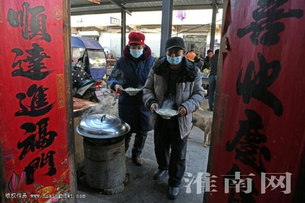 ▲12月21日,安徽省淮南市壽縣安豐塘鎮(zhèn)蘇王街道老夫妻姚傳永(中)、胡多平3元一碗熱乎乎的餃子溫暖鄉(xiāng)村老人。