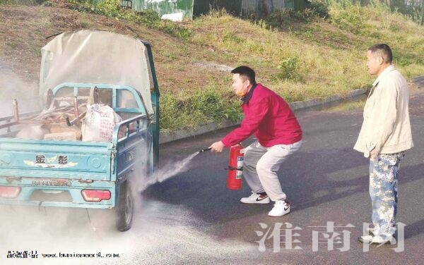 見此情景,陳法輝趕緊將公交車安全地靠路邊,迅速取出公交車上的車載滅火器,下車沖向著火的電動三輪車。依照平時公司消防演練培訓的相關技能,陳法輝熟練地展開滅火作業。