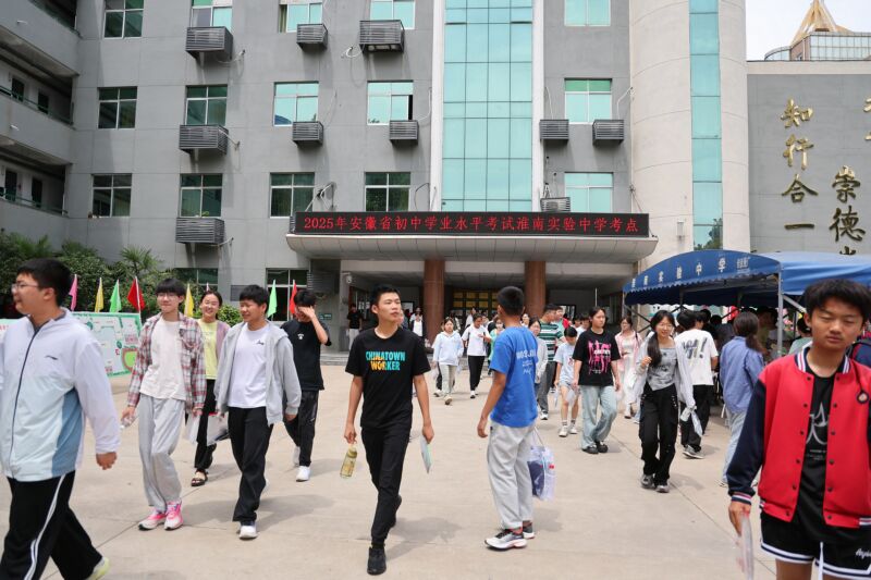 6月14日,為期三天的2025年安徽省初中學業水平考試開考。我市共有40362名考生報名應試,他們將分布在27個考點、1348個考場參加考試。圖為6月15日中午,參加完數學科目考試的學生走出考點。
