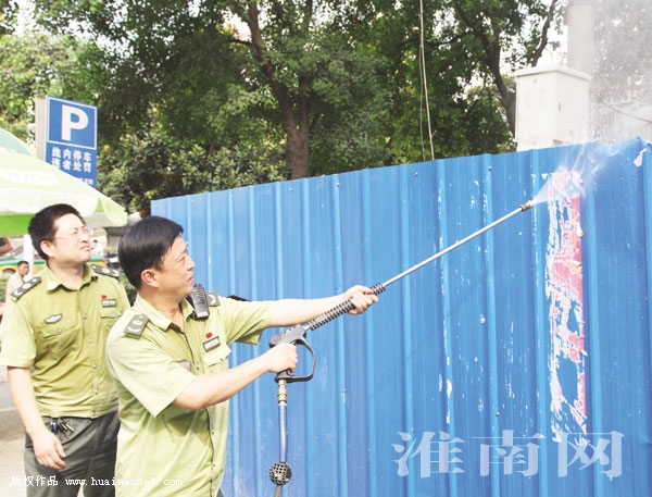 我市城管部門將加強城市管理作為創(chuàng)建文明城市的重要保障,按照精細化、網(wǎng)格化管理要求,嚴格落實工作責任,分線作戰(zhàn)、分片包保,大力開展市容治理攻堅行動,著力營造干凈、整潔、文明、有序的城市環(huán)境。圖一為噴霧壓塵車在路面灑水除塵。圖二為城管工作人員清除街頭非法小廣告。